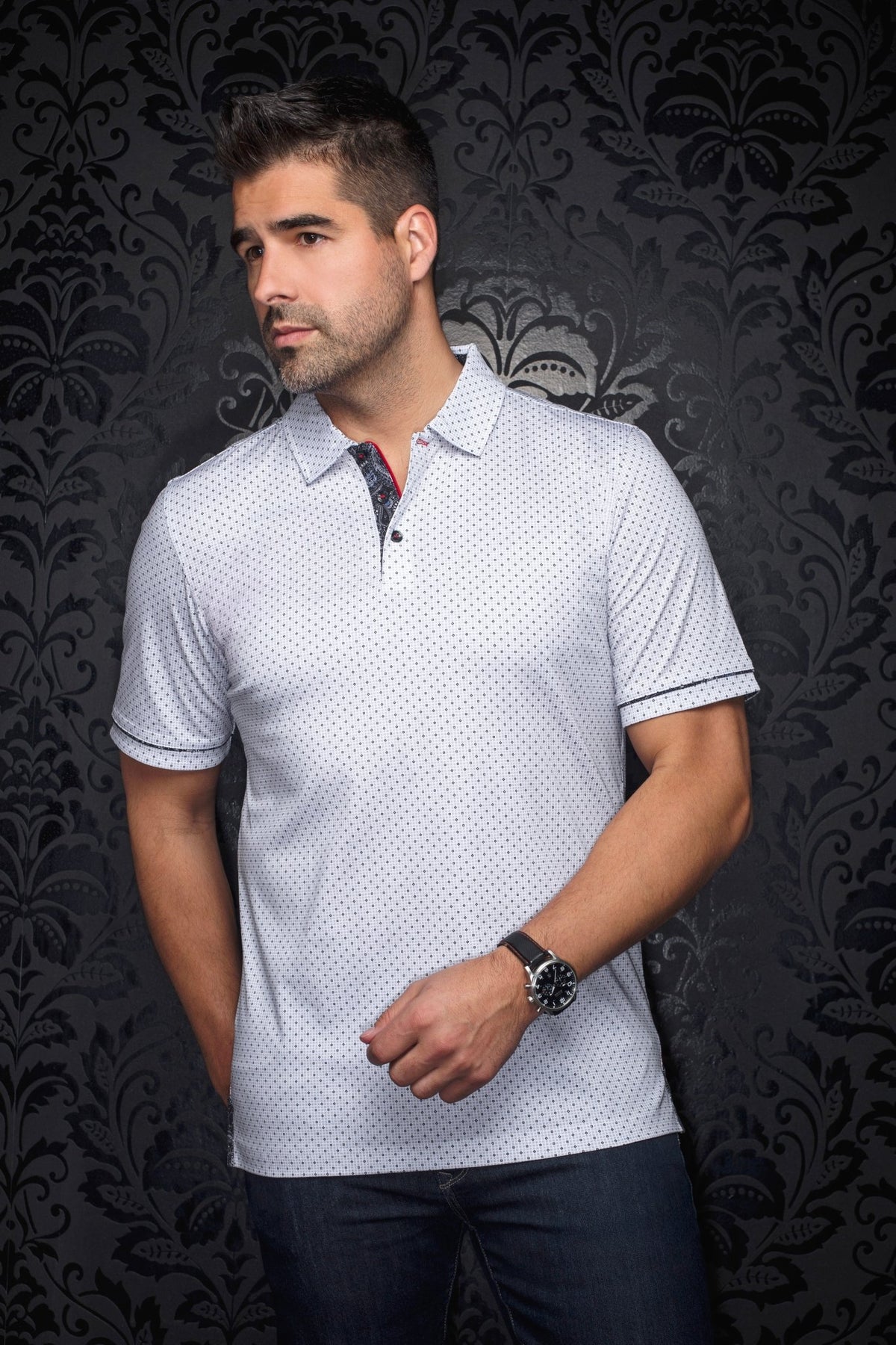 - Contrasting collar and refined details