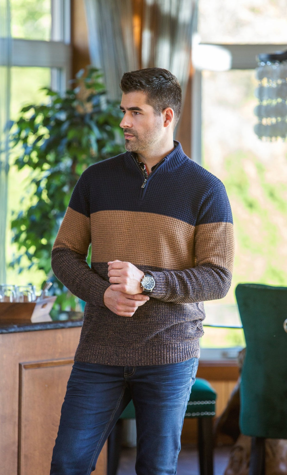 Le chandail DALVIK est soigneusement confectionné avec un mélange de laine mérinos extra fine. Il présente un col montant, des poignets et une taille en maille côtelée pour un ajustement confortable, ainsi qu'une fermeture à glissière (1/4) en métal pour un style rafiné et sportif. Le pull est fabriqué à partir d'un fil à torsion élevée, ce qui non seulement renforce sa durabilité, mais permet également une respirabilité et le rend hygroscopique, capable de gérer efficacement l'humidité. De plus, il bénéficie de propriétés hydrofuges et peut être facilement lavé en machine, restant sans rides même après de nombreux lavages. Ce pull de qualité supérieure est renforcée par la facilité de lavage en machine. Le modèle, mesurant 6'1", porte une taille M à titre de référence.